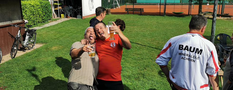Am letzten Spieltag stand der Showdown der beiden ungeschlagenen Mannschaften TSG TC Fautenbach/TC Kappelrodeck/TC Ottenhöfen und der TSG TC RG Durbach/TC Rammersweier um die Meisterschaft der 1. Bezirksklasse an. Der Tabellenführer aus Fautenbach ließ dem Tabellenzweiten von Anfang an keine Chance, zur Verteidigung der Gäste muss man sagen, dass die Fautenbacher komplett besetzt antreten konnten, die Durbacher hatten zwei Ausfälle zu verkraften. Christian Haas beeindruckte in einem tollen Match, Andreas Motzkus wie immer souverän, Kai Unger mit einem tollen Spielstil, Jochen Fischer-Seidler mit tollem Netzspiel, Ralph Becker ruhig und gelassen und auch Mario Bauhöfer kämpfte seinen Gegner im Match-Tiebreak nieder. Nach den Einzeln war der Aufstieg in die 2. Bezirksliga bereits gebucht, dennoch sahen die zahlreichen Zuschauer noch drei tolle Doppel, welche Kai Unger/ Michael Schaffer, Peter Hofmann/Jochen Fischer und Mario Bauhöfer/Ralph Becker gewinnen konnten. Mit 9:0 triumphierten die starken Fautenbacher, gewürzt mit einer Prise Ottenhöfen. Die Gegner aus Durbach konnten sich mit 8kg Spare Ribs, Grillwürsten und verschiedenen Salaten trösten. Auch für die Stamm-Zuschauer war noch genug Grillgut, sowie isotonische Kaltgetränke vorhanden und so feierten die siegreichen Herren 30 inklusive Ersatzspieler und Zuschauer bis in die späten Abendstunden. Einige Runden Dart und viel „Dumm-Gebabbel“ rundeten den tollen Tag ab.